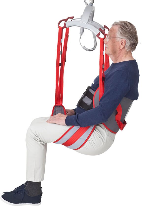 Molift RgoSling LowBack Toilet posiada kilka alternatywnych pętli na obu ramionach i pasach na nogi, które pozwalają dostosować kąt siedzenia do potrzeby pacjenta.