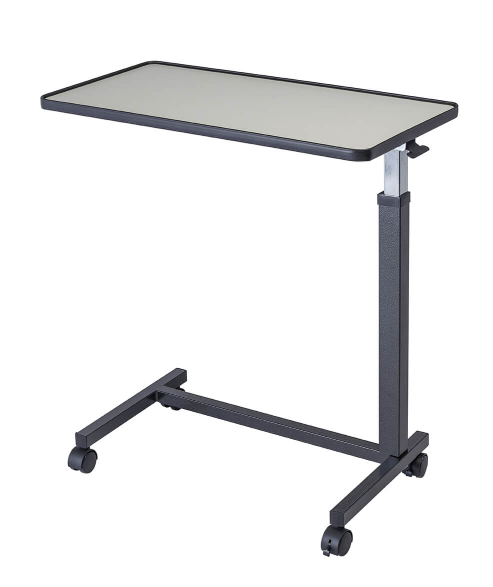 Duży zakres regulacji, laminowany blat z podwyższonymi krawędziami, zabezpieczającymi przedmioty przed zsuwaniem się.