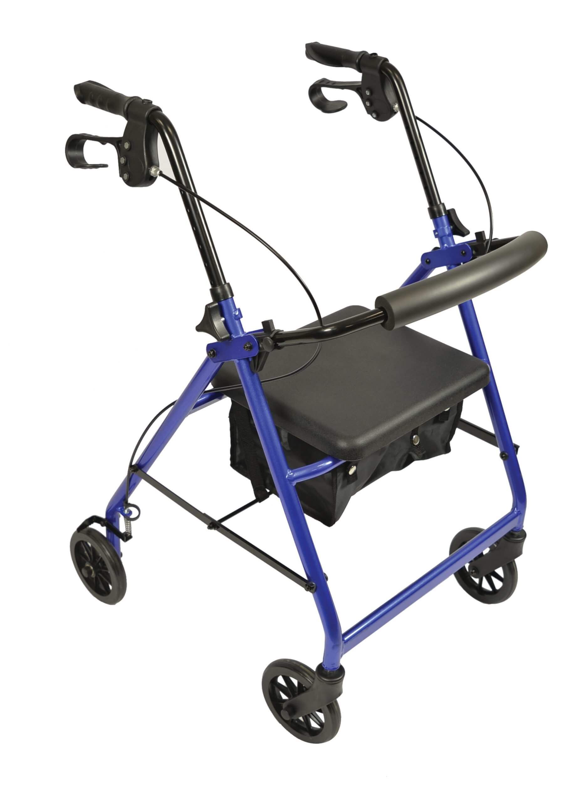 Lekka, czterokołowa, aluminiowa oraz składana podpórka. Wyposażona w hamulec z blokadą kół tylnych, koszyk na zakupy i komfortowe siedzisko.