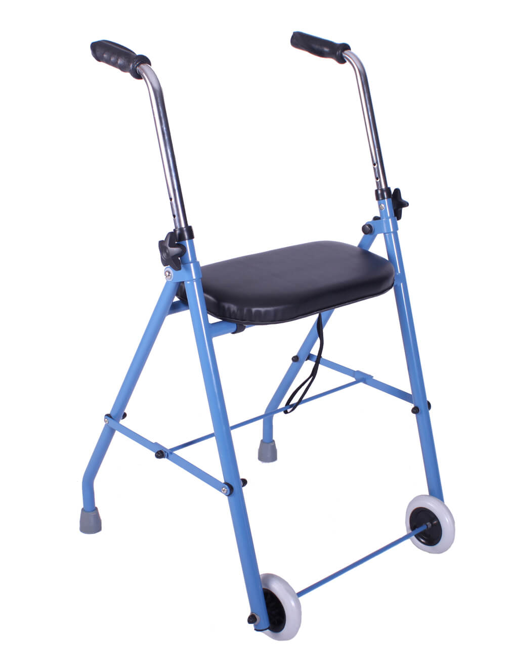 Podpórka dwukołowa z ławką wyposażona została w dwa anatomiczne uchwyty z bezpieczną regulacją wysokości. Charakteryzuje ją łatwe składanie dzięki centralnej osi. Ławka wykonana jest z komfortowej i miękkiej pianki pokrytej tworzywem PVC.