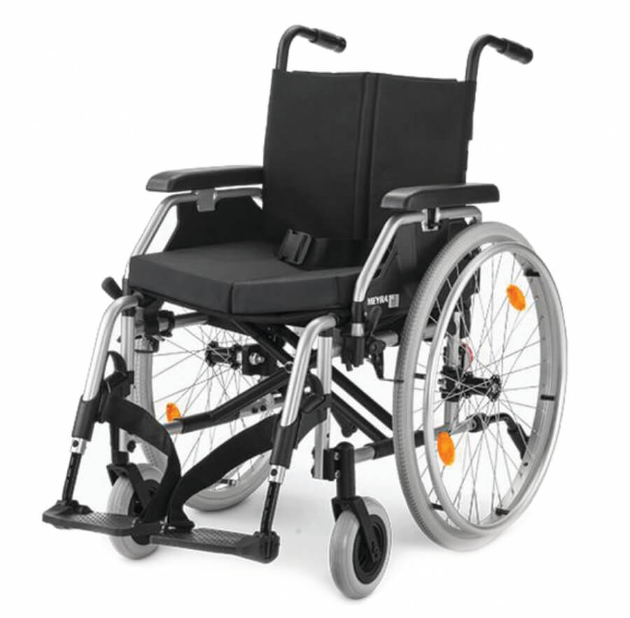 Lekki wózek inwalidzki aluminiowy Eurochair 2 Meyra stab renomowanej niemieckiej firmy Meyra. Posiada szeroki zakres konfiguracji. Dzięki ramie krzyżakowej umożliwia szybkie oraz łatwe składanie. Posiada 6 szerokości siedziska: 38 40 43 44 48 50. Boczki są odchylane oraz zdejmowane, a podłokietnik posiada regulację w zakresie wysokości od 21 do 26cm. Dzięki dużym oraz pełnym przednim kołom 18cm, świetnie pokonuje przeszkody, a to tylko nie które z cech wózka Eurochair 2 Meyra
