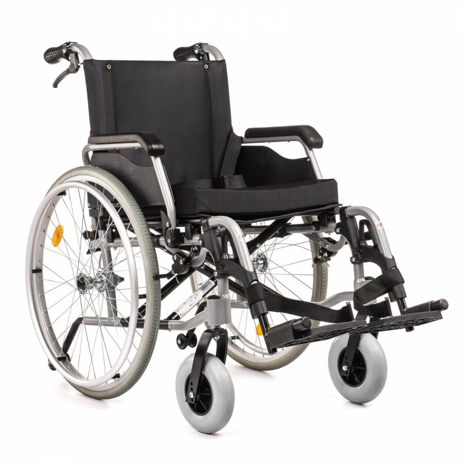 Wózek inwalidzki to aluminiowa konstrukcja o optymalnych standardach. Posiada na wyposażeniu komplet pasów które zabezpieczają pacjenta na wszelkie sposoby, oraz posiada wiele możliwości regulacji w celu dopasowania indywidualnych potrzeb. Stabilny napęd tego wózka inwalidzkiego to zarówno bezobsługowe koła przednie, jak i demontowywalny napęd tylny. Komfort podróży zapewniają uchylane podłokietniki i miękka poduszka na nylonowym siedzisku.